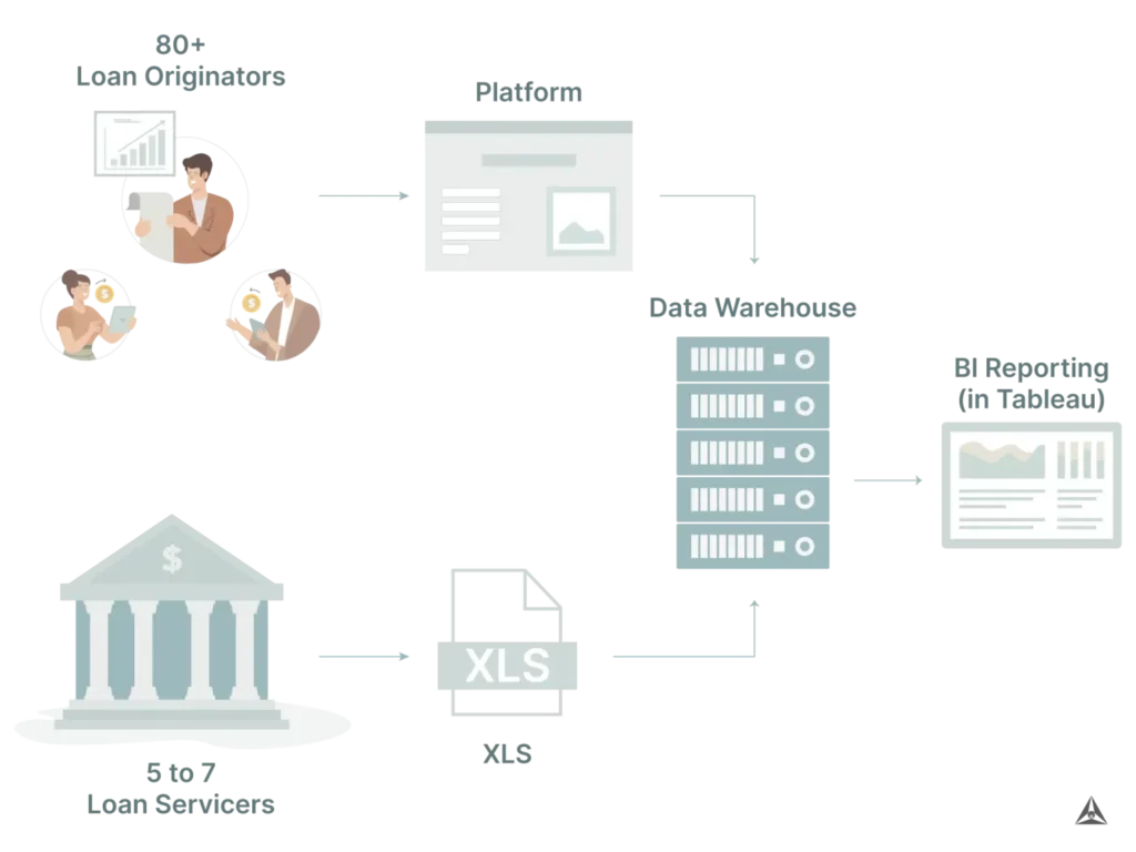 Separate platforms combine the incoming data from the loan originators and loan servicers, and then consolidate the data into a single database, dubbed Bronze DB. This is the master list, so new reports in the future can reference historical data.